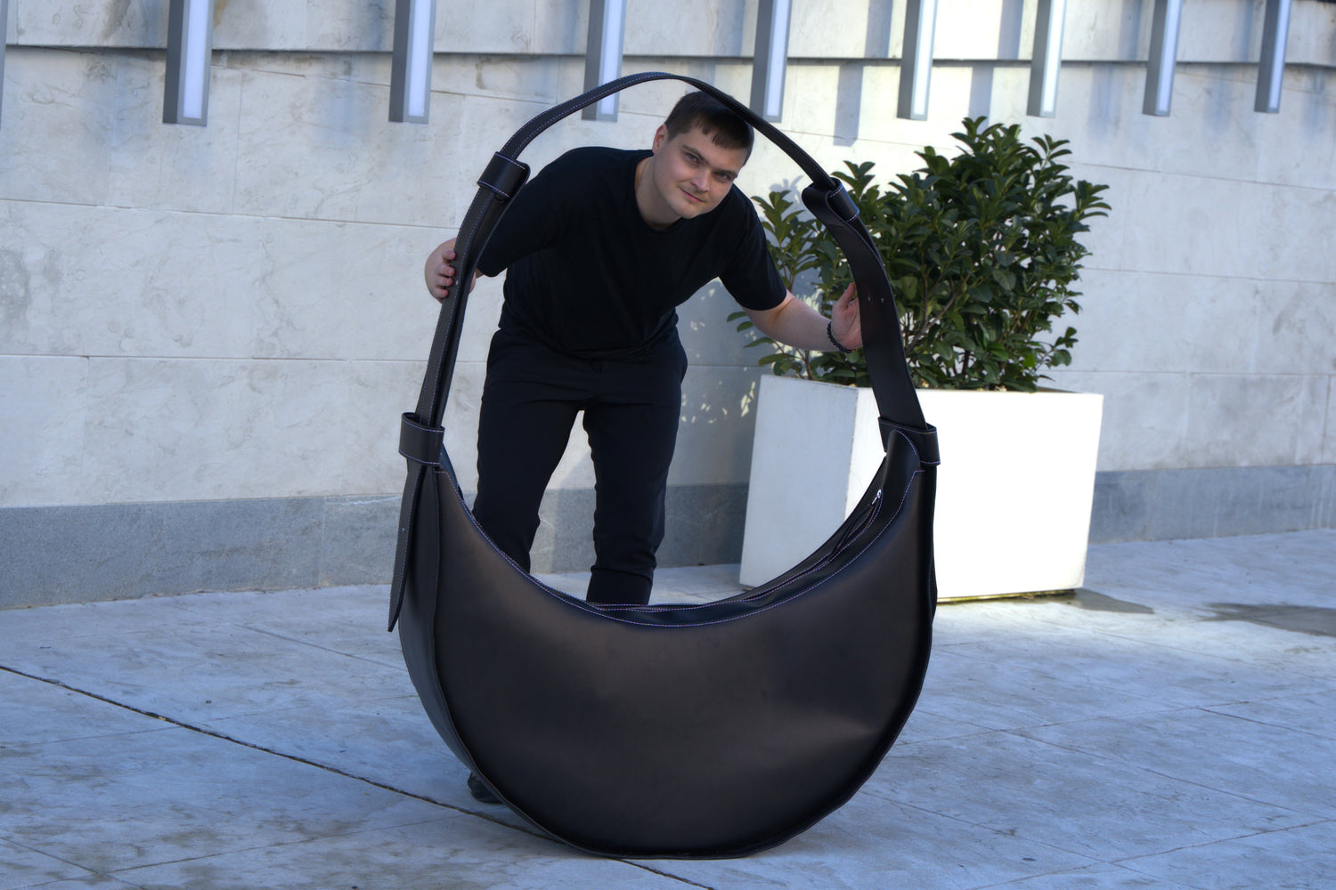 The largest handmade leather bag measuring 148 x 102 x 38 cm